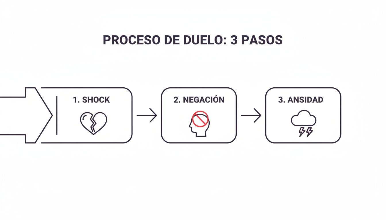 Como ves, el proceso arranca con el impacto emocional (shock), seguido por esa resistencia a aceptar la realidad (negación). Justo después, suele aparecer una intensa inquietud (ansiedad), que prepara el terreno para las siguientes etapas del duelo.